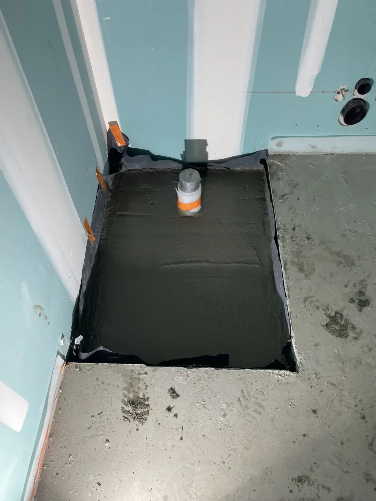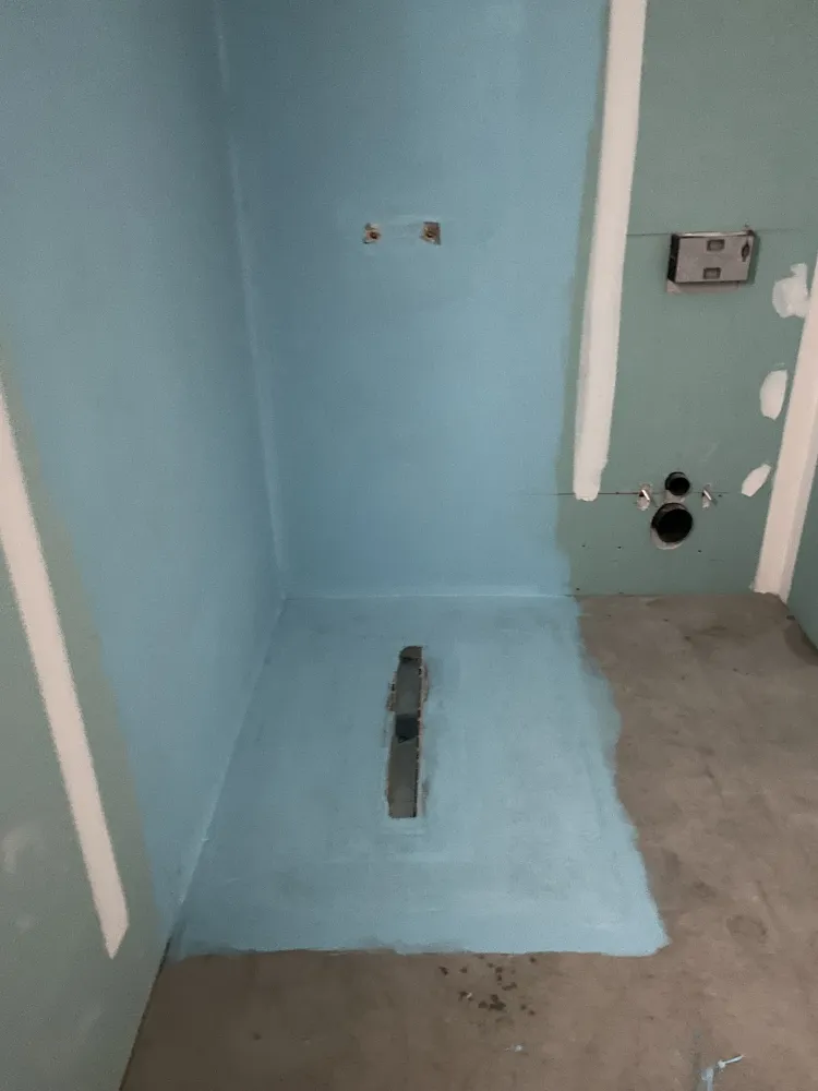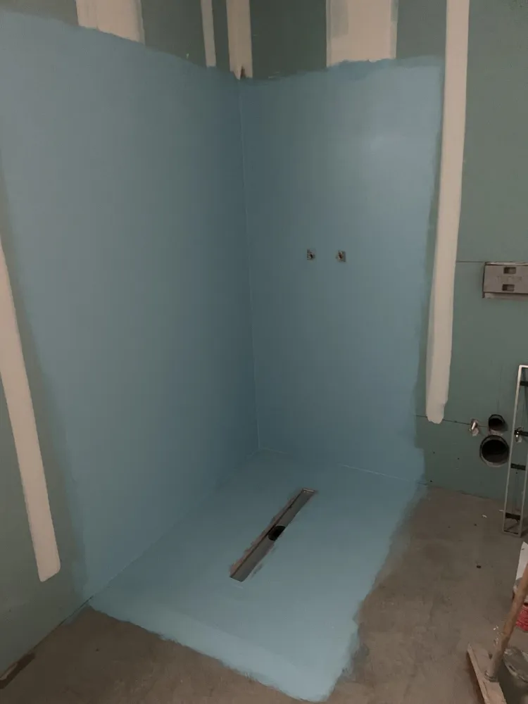 Le carreleur applique une membrane ou résine d’étanchéité sur toute la surface maçonnée, en veillant à bien remonter sur les murs. Les angles et jonctions sont renforcés avec des bandes d’étanchéité pour prévenir tout risque d’infiltration.